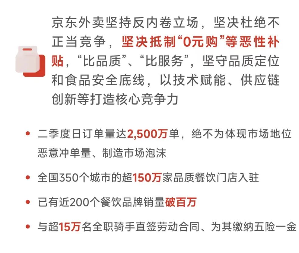 从京东官方的态度来看,外卖等新业务健康发展,收入同比大幅增长199%,成功达成初期战略目标。京东外卖二季度日订单量达2500万单,全国已有350个城市的超150万家品质餐饮门店入驻,已有近200个餐饮品牌销量破百万,与超15万名全职骑手直签劳动合同并缴纳五险一金。另外,定位“品质餐饮合营制作平台”的七鲜小厨首店上线一周日均订单超1000单,复购率高于行业220%,截至7月底已收到超6.6万份报名,计划3年开出1万家。