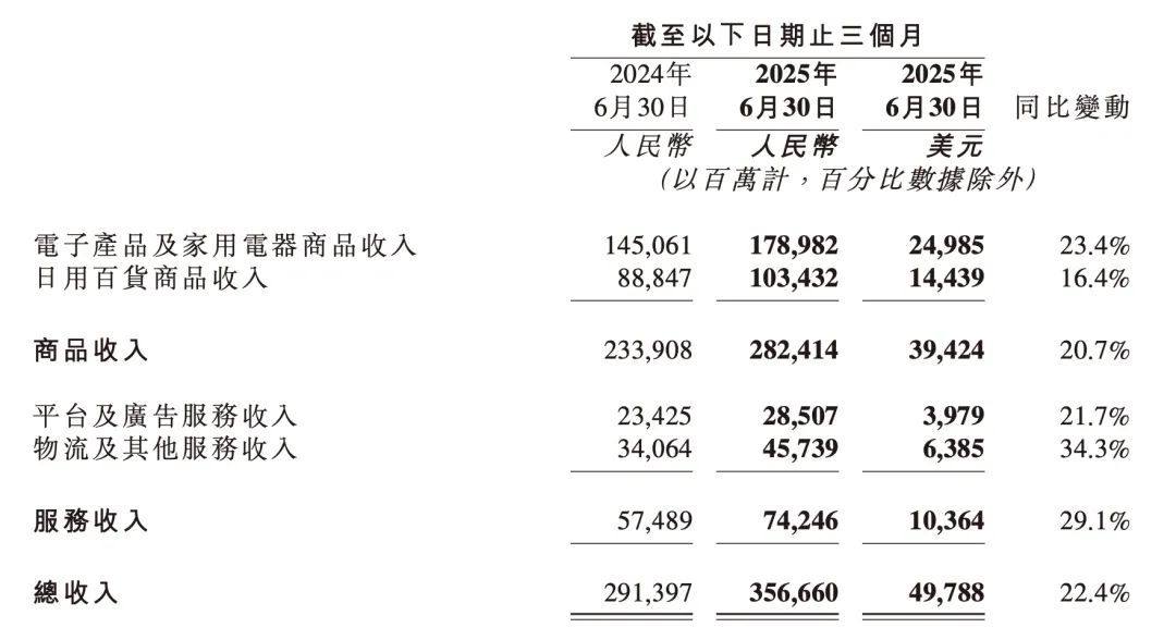 与2024年同期相比,各项收入均获得了超过两位数的同比增长:商品收入增长20.7%,其中带电商品收入增长23.4%,日用百货商品收入增长16.4%;服务收入增长29.1%,其中平台及广告服务收入增长21.7%,物流及其他服务收入增长34.3%。